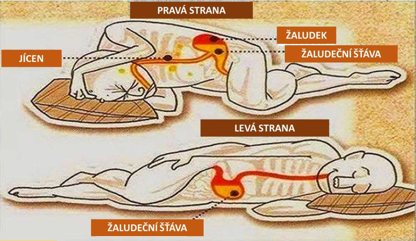 Spaní na levé straně posiluje lymfatický systém a umožňuje tělu zbavit se toxinů a dalších škodlivých látek, které v sobě za den nahromadilo. Obecně se říká, že levá strana je stranou lymfy.Pokud se vám špatně tráví, také pomáhá spánek na levé straně. Žaludek, střeva a slinivka totiž v této poloze zaujímají také svou přirozenou polohu na rozdíl od spánku na pravém boku. Díky gravitaci pomáhá levá strana k lepší průchodnosti střev a vy se následně ráno přirozeně vyprázdníte.Jestli vás pálí žáha, také je nutné spát nalevo. Odvíjí se to od pozice žaludku. Ten visí přirozeně dolů a žaludeční kyseliny tak nemají šanci přelévat se do jícnu. V těhotenství, kdy vás pálení žáhy doslova ničí, je to naprosto nezbytné.I vaše srdce ocení spánek na levém boku. Srdce v této poloze pumpuje krev přímo do sestupné aorty. Vaše krev tak putuje přímo k srdci, které je ve výsledku i zdravější.Vaše nálada se prý také odvíjí od toho, na kterém boku spíte. Jogíni říkají, že pokud chcete sršet energií a mít úsměv od ucha k uchu, musíte taktéž spát na levé straně.Jste-li těhotné, pak pamatujte, že spánek na levém boku dopomáhá lepšímu okysličování plodu a přináší taktéž klidnější spánek. Tento spánek také uleví od otoků kotníků a kloubů dolních končetin.Pokud spíte na zádech, je to v pořádku. Tato poloha je neutrální.Spánek na břiše lékaři příliš nedoporučují.